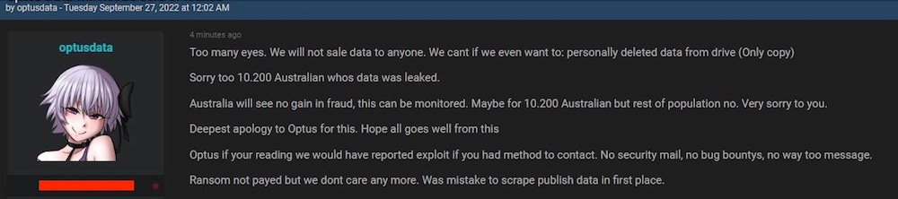 Having their OPSEC punctured would certainly be a wake-up call and could well make a cybercriminal reevaluate the risk/reward benefit. (Our second favourite hypothesis is that Optusdata's mother walked into their bedroom, found 11.2 million Optus records lying around and told them to knock it off).