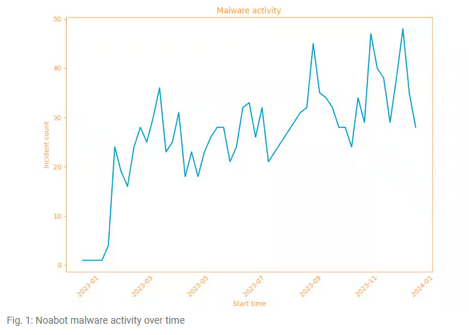 NoaBot: Akamai researchers have uncovered a new malware botnet named NoaBot that has been seen infecting servers across the world. NoaBot is built on top of the Mirai SSH self-spreading worm but drops a cryptocurrency miner on infected systems. Akamai says the botnet has been silently expanding since January of 2023 and appears to be connected to the P2PInfect botnet that targets Redis databases, also for cryptomining.