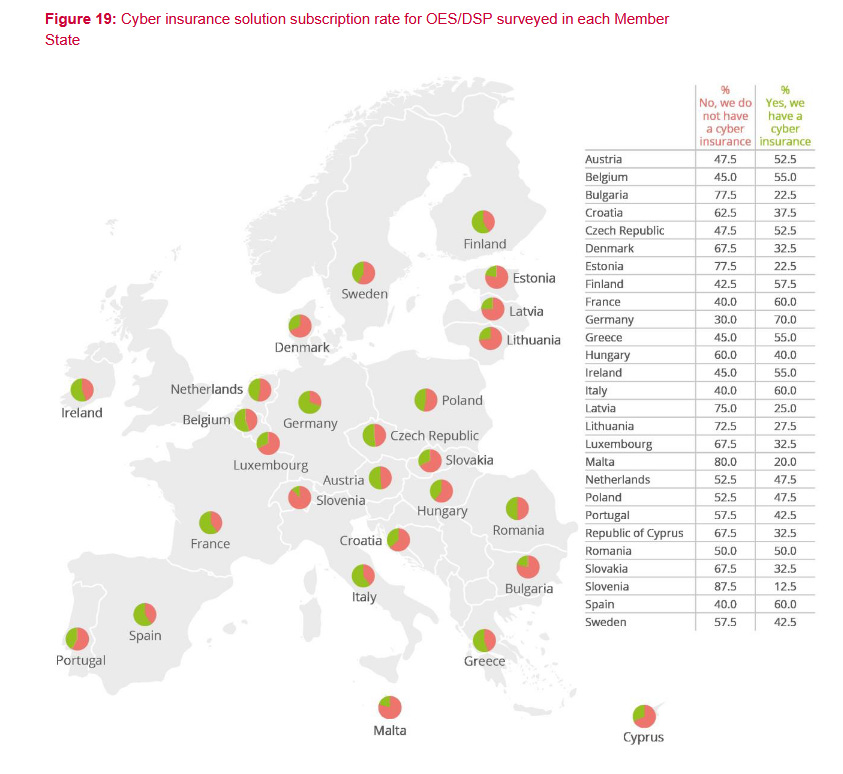 The report notes that while cyber insurance coverage was at 43% in 2020 and just 30% in 2021, the cyber insurance market now appears to be active and developed all over the EU.