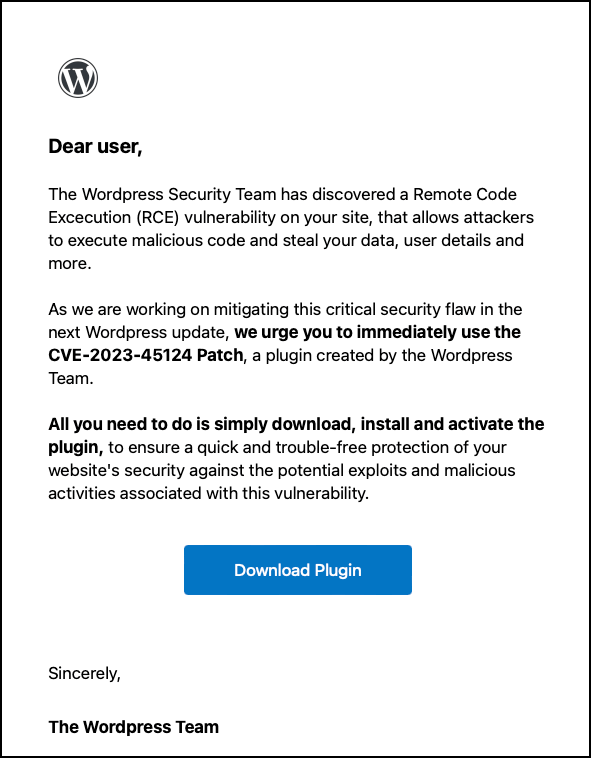 WP phishing campaign: A threat actor is posing as the WordPress security team in a phishing campaign targeting owners of WordPress sites. The campaign is advertising a patch for a non-existent CVE (CVE-2023-45124) and lures site admins into installing a backdoored plugin.
