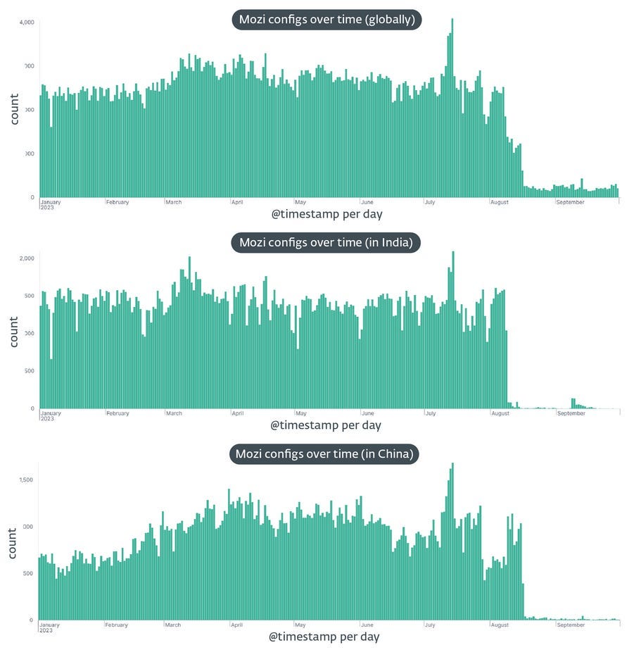 Mozi botnet goes down: The Mozi botnet has finally gone down for good after a mysterious entity removed its malware from infected IoT devices across the globe. The removal took place at the end of August, with infected hosts being first removed from systems in India and then from China. Security firm ESET says the Mozi takedown was executed with a special killswitch component that was signed with the malware's original private key. The company couldn't say if the killswitch was activated by the Mozi botnet creators or by Chinese law enforcement, which detained some of the Mozi authors in June 2021. First spotted in November 2019, the botnet infected more than 1.5 million devices across its lifetime, peaking at 160,000 infected systems in September 2020.