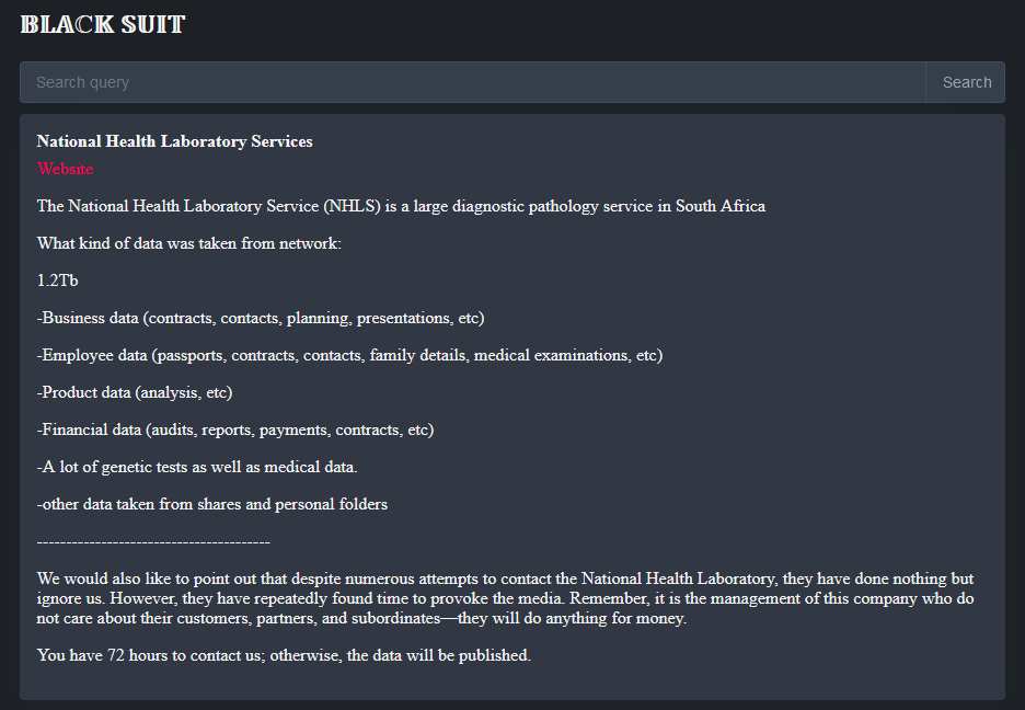 After Health-E News leaked the attackers' identity on Thursday last week, the Black Suit ransomware group formally took credit for the attack a day later through a post on their dark web leak site—once again trying to blame the government's stubbornness against paying the ransom for all the potential fallout.