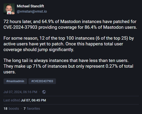 Mastodon security update: The Mastodon project has released a major security update to patch a vulnerability impacting Mastodon social media servers. Tracked as CVE-2024-37903, the vulnerability allows threat actors to modify a post's audience and make private content available to the public. The Mastodon project says it will provide additional details on Monday, July 15. Four days after the patch, 65% of all Mastodon servers have already applied the patch, covering roughly 85% of all Mastodon users.