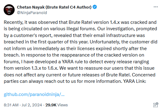 Brute Ratel leak: A threat actor has leaked [archived] a cracked version of the Brute Ratel offensive red team tool. The tool is often abused by cybercrime and state-sponsored groups for their operations. The leak covers Brute Ratel version 1.4, initially released in October 2022. The current Brute Ratel version is 2.0. The tool's creator has released [archived] YARA rules to help defenders detect the leaked version if used inside their networks.