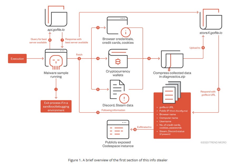 Rust-based infostealers: Trend Micro has a breakdown of a Rust-based infostealer that abuses GitHub's Codespaces feature to community cate with its C2 and exfil data.
