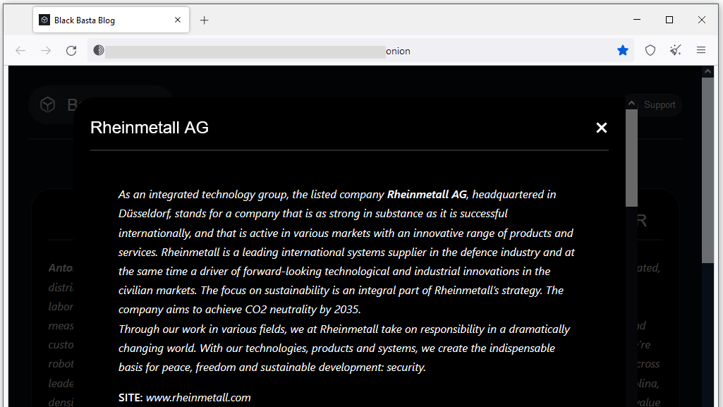 Rheinmetall claim: The Black Basta ransomware gang has listed Rheinmetall AG on their leak site. The German company is one of the world's largest weapons manufacturers and has recently announced plans to build tanks at a Ukroboronprom plant in Ukraine. The gang shared screenshots of a small number of documents perpetrating to have been stolen from the company's network. Rheinmetall has not confirmed the incident.