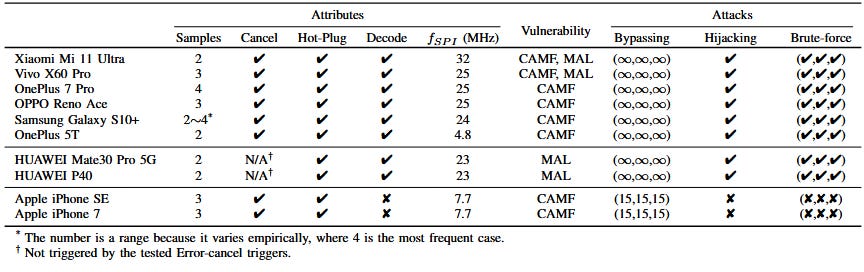 BrutePrint: A team of academics has published details about BrutePrint, an experimental technique that can be used to brute-force fingerprint authentication on some modern smartphones. The researchers claim their BrutePrint toolkit uses two zero-day vulnerabilities in the smartphone fingerprint authentication (SFA) framework to bypass smartphone security features such as rate limits and finger liveness detection. They claim the BrutePrint toolkit brute-forced fingerprints on eight of the ten tested smartphones, such as Samsung, Xiaomi, OnePlus, Huawei, Vivo, but not the iPhone (see table below).
