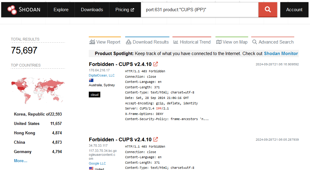 Even if CUPS ships disabled by default on most distros, according to Shodan, there are currently over 75,000 systems running CUPS exposed over the internet, which is quite an attractive piece of pie if you're an attacker. Other scans have these numbers at over 107,000, but they could be even bigger than this.