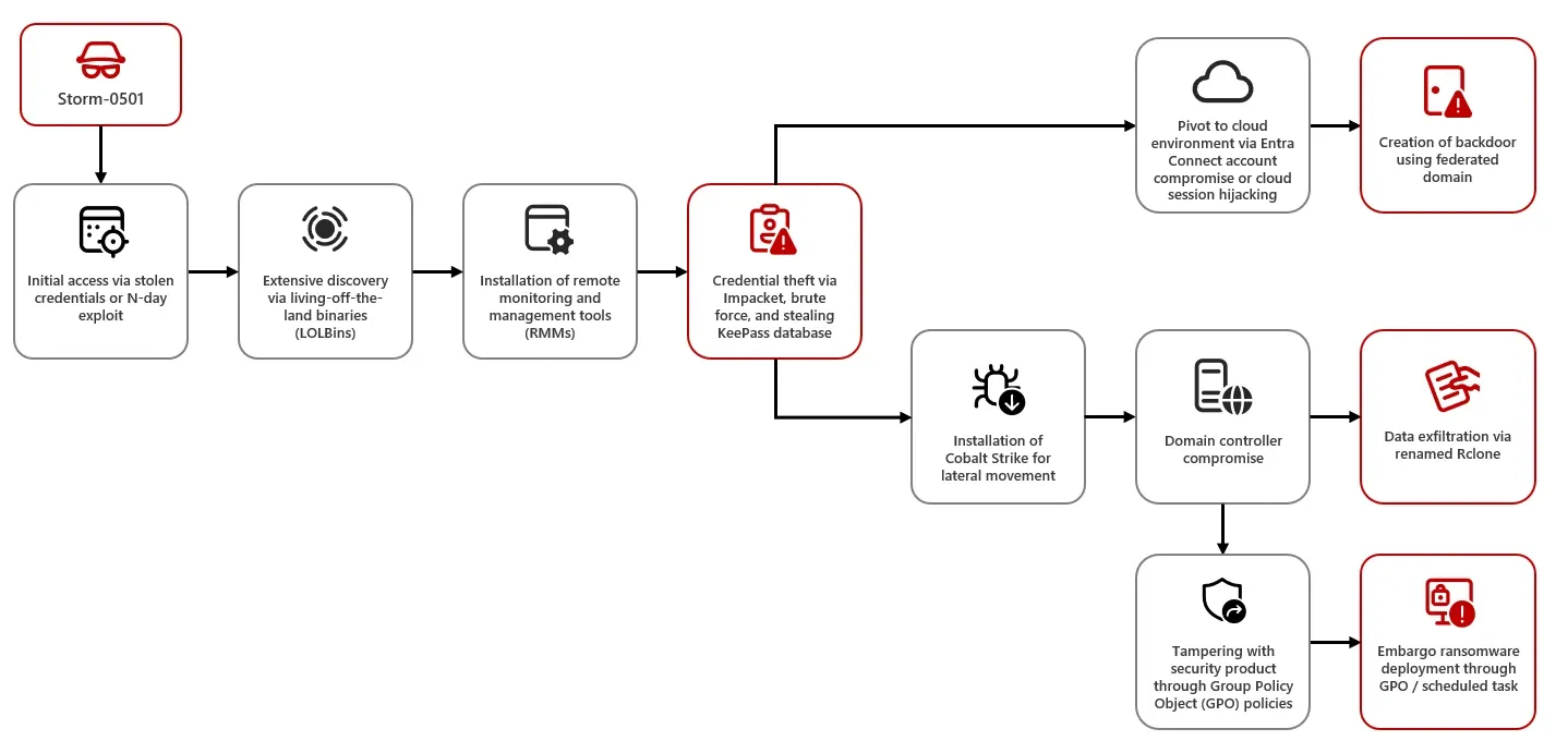Storm-0501 goes after hybrid cloud environments: Microsoft's security team says that a threat actor tracked as Storm-0501 is now targeting hybrid cloud environments. The group breaches local networks and then pivots to a company's cloud environment, where it leaves backdoors for future access. Storm-0501 emerged in early 2021 and deployed the Sabbath (54bb47h) ransomware in its first attacks. The group eventually became an affiliate for other larger RaaS platforms and is currently using the Embargo ransomware for its operations.