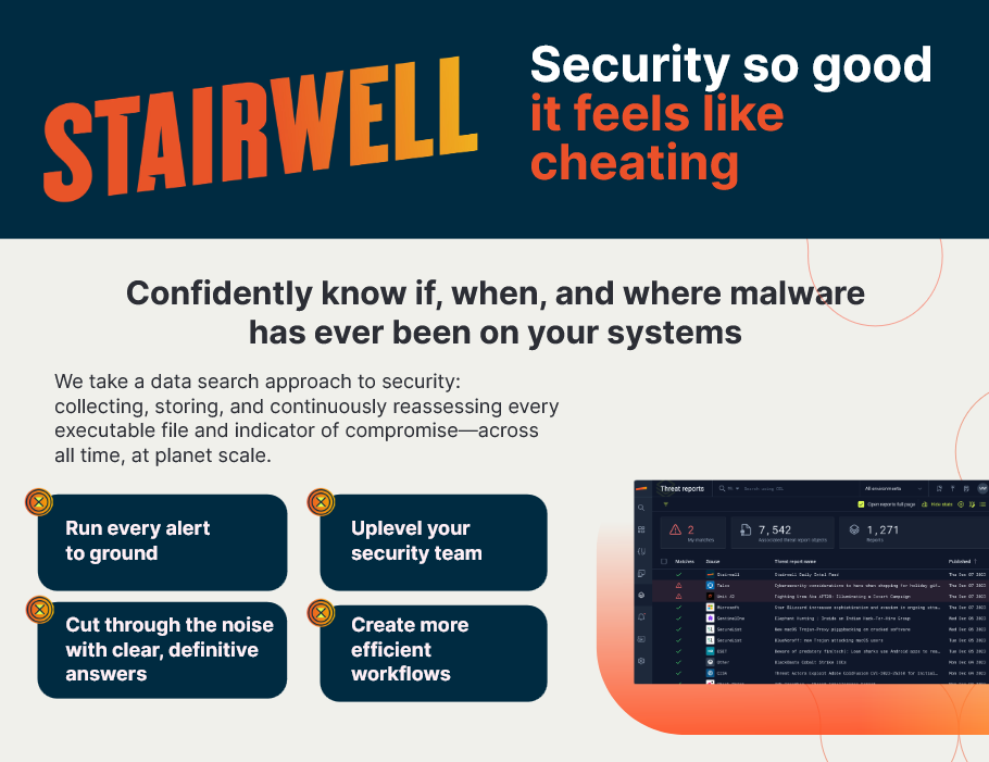 Stairwell gives you the confidence to know if, when, and where malware has ever been on your systems. We take a data search approach to security: collecting, storing, and continuously reassessing every executable file and indicator of compromise — across all time, at planet scale.