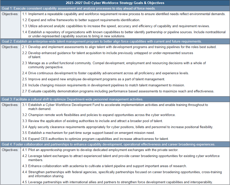 DOD embraces remote work: The US Department of Defense has released its Cyber Workforce Strategy for the next five years as part of the department's attempt to address its cybersecurity workforce shortage. The strategy, here in full [PDF], sets out four main goals (see image below), with the highlights being on allowing for remote work, improving the incentives program to compete with the private sector, and tapping into "under-represented sources of talent" such as minorities, people of color, and women, all of which are not well represented in the private sector. [Press coverage in the Federal News Network]
