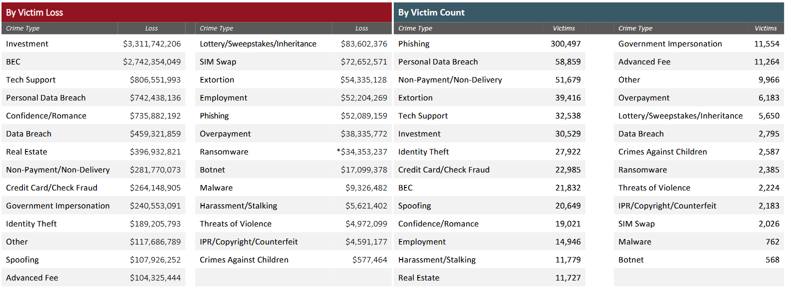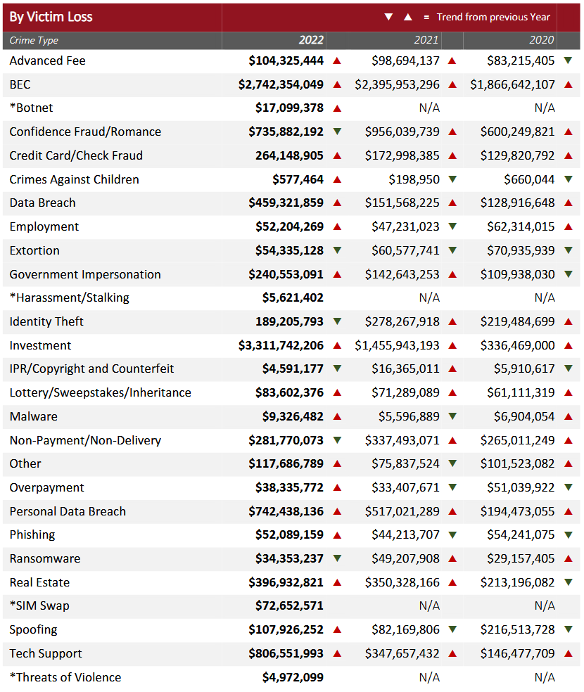 Furthermore, both BEC and investment fraud were also the only crime types that had losses in the realm of "billions," while everything else was in the millions mark.