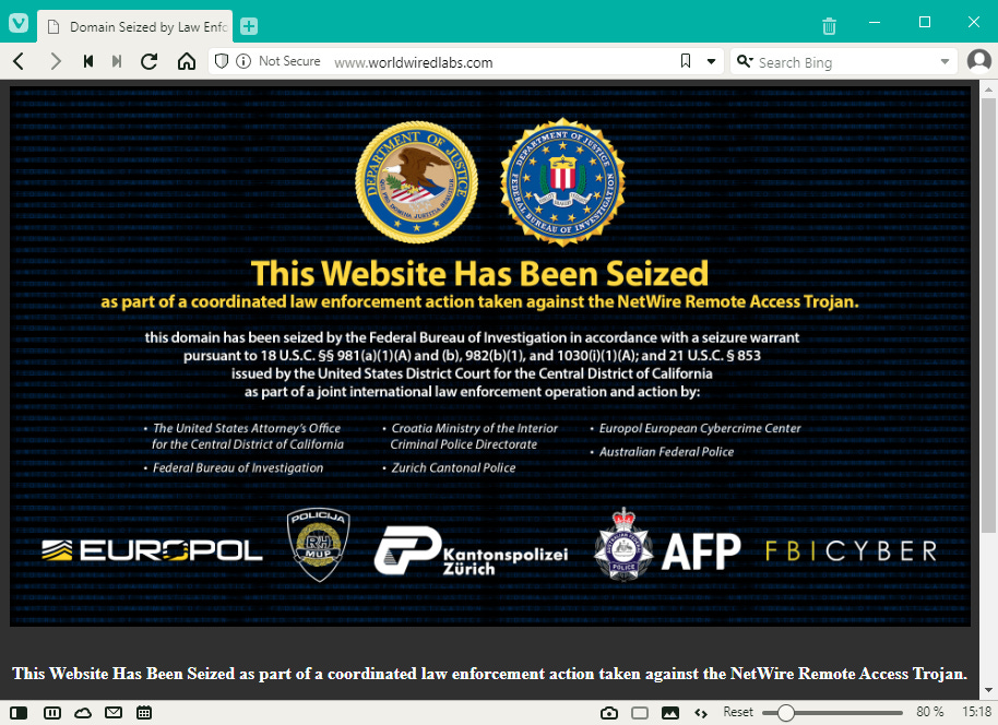 NetWire author detained: US and Croatian authorities announced they arrested a Croatian national who operated a website that sold access to the NetWire remote access trojan. The NetWire RAT has been available for sale on underground forums and through its official website since 2012. Today, it is both one of the cheapest and one of the most widely used remote access trojans, marketed for as low as $80. While officials have not disclosed the suspect's name, infosec reporter Brian Krebs says the suspect took few steps to hide their real identity, which Krebs identified as a man named Mario Zanko. Beside's the suspect's arrest, US authorities have also seized the RAT's official website, located at worldwiredlabs[.]com.