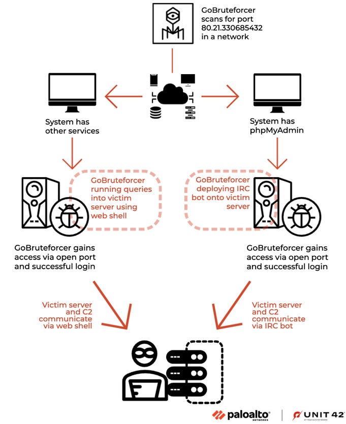 GoBruteforcer: Researchers with Palo Alto Networks have discovered a new Go-based malware strain. Named GoBruteforcer, the malware has been used to launch brute-force attacks against web servers running phpMyAdmin, MySQL, FTP, and Postgres services. Infected systems are added to the GoBruteforcer botnet and used to compromise new hosts and help the botnet grow in size.