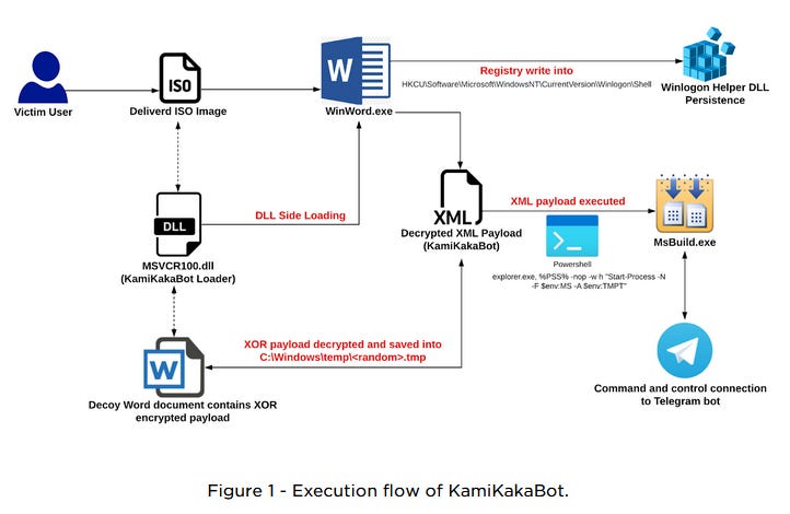 KamiKakaBot: EclecticIQ researchers have put out a report on KamiKakaBot, a malware loader used in operations by Dark Pink, a suspected Chinese APT they say is targeting ASEAN countries. KamiKakaBot is one of the four main/custom tools used by this group, as detailed in Group-IB's initial report. The others are TelePowerBot, and the Cucky and Ctealer information stealers.