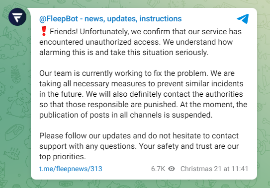 FleepBot hack: Telegram automation service FleepBot says it was hacked over the weekend and abused to post messages to customer accounts. The incident primarily impacted Ukrainian Telegram channels. The attackers posted messages urging Ukrainians to lay down their arms and surrender. FleepBot says it disabled its bot following the attack. The FleepBot service is managed by a Russian company based in the city of Volgograd. [Additional coverage in UNN]