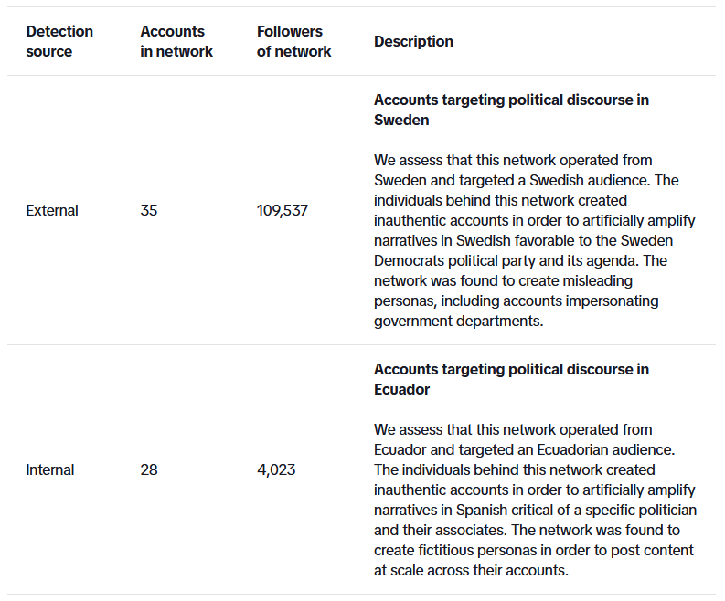 TikTok info-ops takedowns: TikTok disrupted two influence operations active on its service last month, one from Sweden and one from Ecuador.