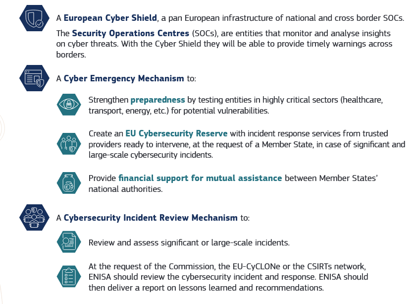 The first goal is to establish what the EU calls a European Cybersecurity Shield. In practice, the EU plans to interconnect the national Security Operations Centres (SOCs) of member states in order to boost information sharing.