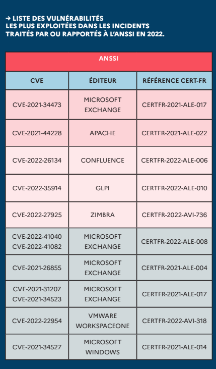 ANSSI yearly report: France's cybersecurity agency ANSSI has published its yearly activity and threat report for the year 2022. The report is only available in French for now, but English versions are also published in the following days. APTs continued APTing, basically. The list of top exploited vulnerabilities, as seen by the agency, is below.