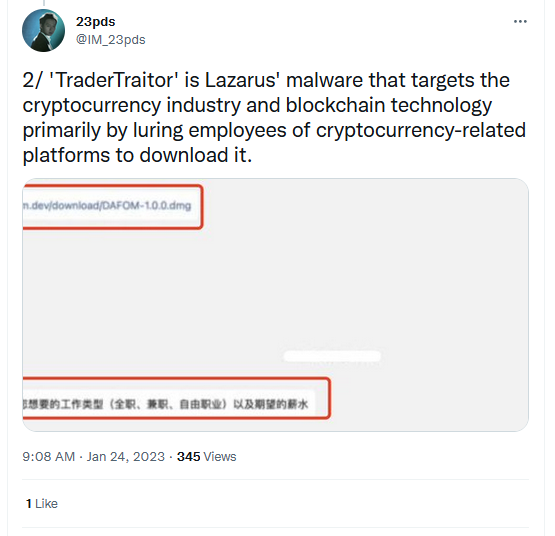 The FBI says that in both intrusions, the Lazarus gang used a form of malware known as TraderTraitor to compromise employee systems. US officials and security experts say the malware is typically delivered via emails or private messages sent to a company's employees disguised as high-paying job offers.