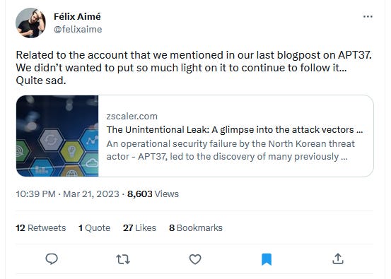 APT37 (ScarCruft, Reaper): Zscaler says it identified a GitHub repository operated by one of the members of the APT37 North Korean hacking group. The repository appears to have been used to host payloads and other files for APT37 as far back as October 2020. Zscaler says malware samples found in the repository were not previously observed anywhere else and allowed the company's researchers to gain additional insights in the group's recent operations, killchains, and targets—typically targeting South Korean individuals. Zscaler says its report complements a previous one from Sekoia. On the other hand, Sekoia researchers say they also knew about the GitHub repo as well, but they chose to intentionally leave it out of their report and monitor it for updates and insight into future APT37 ops.