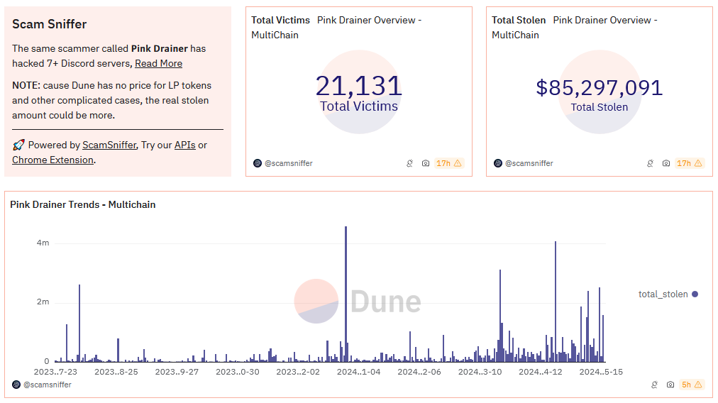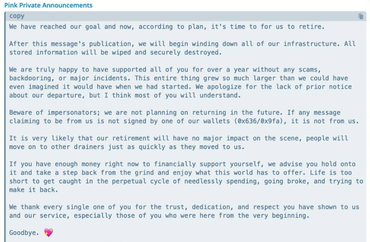 Pink Drainer shuts down: Cryptocurrency phishing service Pink Drainer has shut down operations after stealing over $85 million from more than 21,000 victims. The service launched in July of last year and allowed threat actors to deploy phishing pages specialized in stealing from cryptocurrency accounts. In a message posted on Telegram, the Pink Drainer administrator said they would wind down servers and delete past customer data. Pink Drainer is the third crypto-phishing service to shut down over the past year after Monkey Drainer and Inferno Drainer.