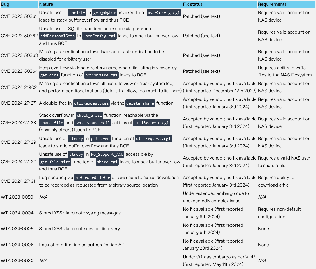 QNAP unpatched vulnerabilities: Security firm watchTowr Labs has found 15 vulnerabilities in the firmware of QNAP network attached storage devices. Some of the vulnerabilities can be used for remote code execution attacks that do not require authentication. watchTowr reported the bugs in December of last year, but the vendor has only patched four of the fifteen so far. The security firm has published a PoC for one of the worst of the 15 bugs.