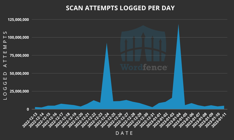 WordPress attacks: Wordfence says it recorded spikes in attacks targeting WordPress sites over the Christmas and New Year holidays, with attackers trying to compromise WordPress sites using exploits for "ancient" vulnerabilities. The activities spikes were very noticeable, and Wordfence says these spikes aren't uncommon because "systems are not as closely monitored" during holidays. Final payloads included common web shells, typically used to take control over hacked websites.