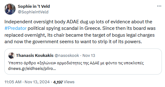 Parallel to ADAE's work, two prosecutors also started a criminal investigation against the Greek government and the EYP in late 2022. Those investigations didn't go smoother either. The Supreme Court intervened in October 2023, stripped the case from the two prosecutors, and reassigned it to someone else—which, if we are to believe the Greek press, appears to have ignored crucial witnesses and evidence.