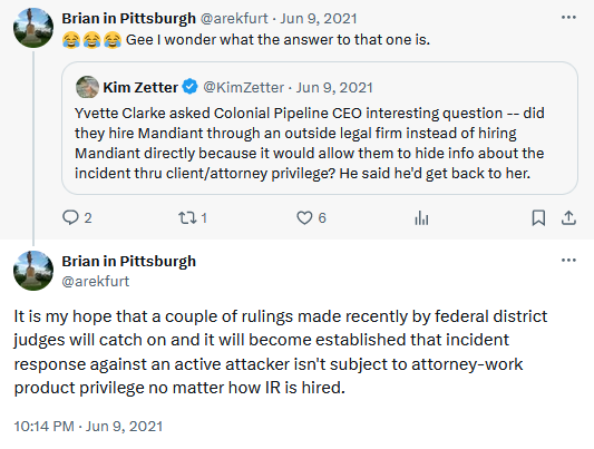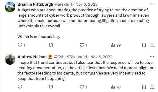Nevertheless, the 2020 Capital One ruling has had a major impact on the IR space. Shortly after the 2020 US decision was published, this newsletter's author heard from two cyber insurance providers that some companies were not only requesting IR reports via their counsels—to make sure client-attorney protected privilege applies—but were also going way above that.