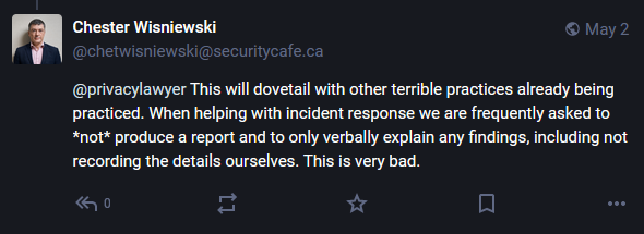 Breached companies began requesting that IR investigators not produce a report at all, instructing that all findings be delivered in oral form. All incident response communications were required to take place via IM clients that supported disappearing messages, and if an IR report needed to be put on paper, it had to contain the least information possible. The main purpose of all of this was to avoid leaving any paper trail that could be used in the discovery process of any possible class-action lawsuit.