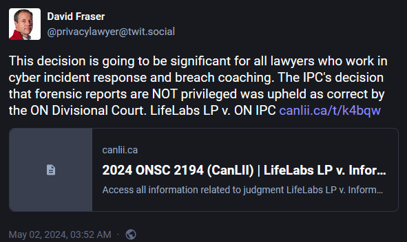 In Canada, the precedent was set in a case related to a data breach at private medical diagnostics company LifeLabs in 2019. Just like Optus, LifeLabs tried to argue that Canadian authorities did not have the right to publish details from its IR report because the document was subject to solicitor-client and litigation privilege. An Ontario divisional court disagreed with LifeLabs' classification.