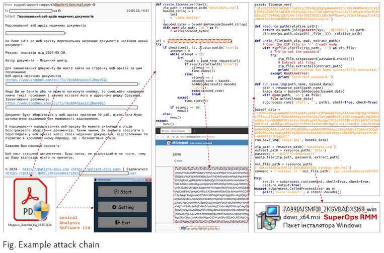 UAC-0188: Ukraine's CERT has discovered a malware delivery campaign that targets Ukrainian organizations. The final payload is a legitimate version of the SuperOps RMM remote management software, which the attackers use to access infected systems. CERT-UA linked the attacks to a group it tracks as UAC-0188. The group was also seen attacking European and US financial organizations.