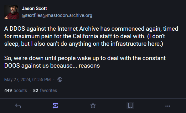Internet Archive DDoS attack: The Internet Archive, the organization behind the Wayback Machine, fell under a DDoS attack on Monday. Reasons unclear.