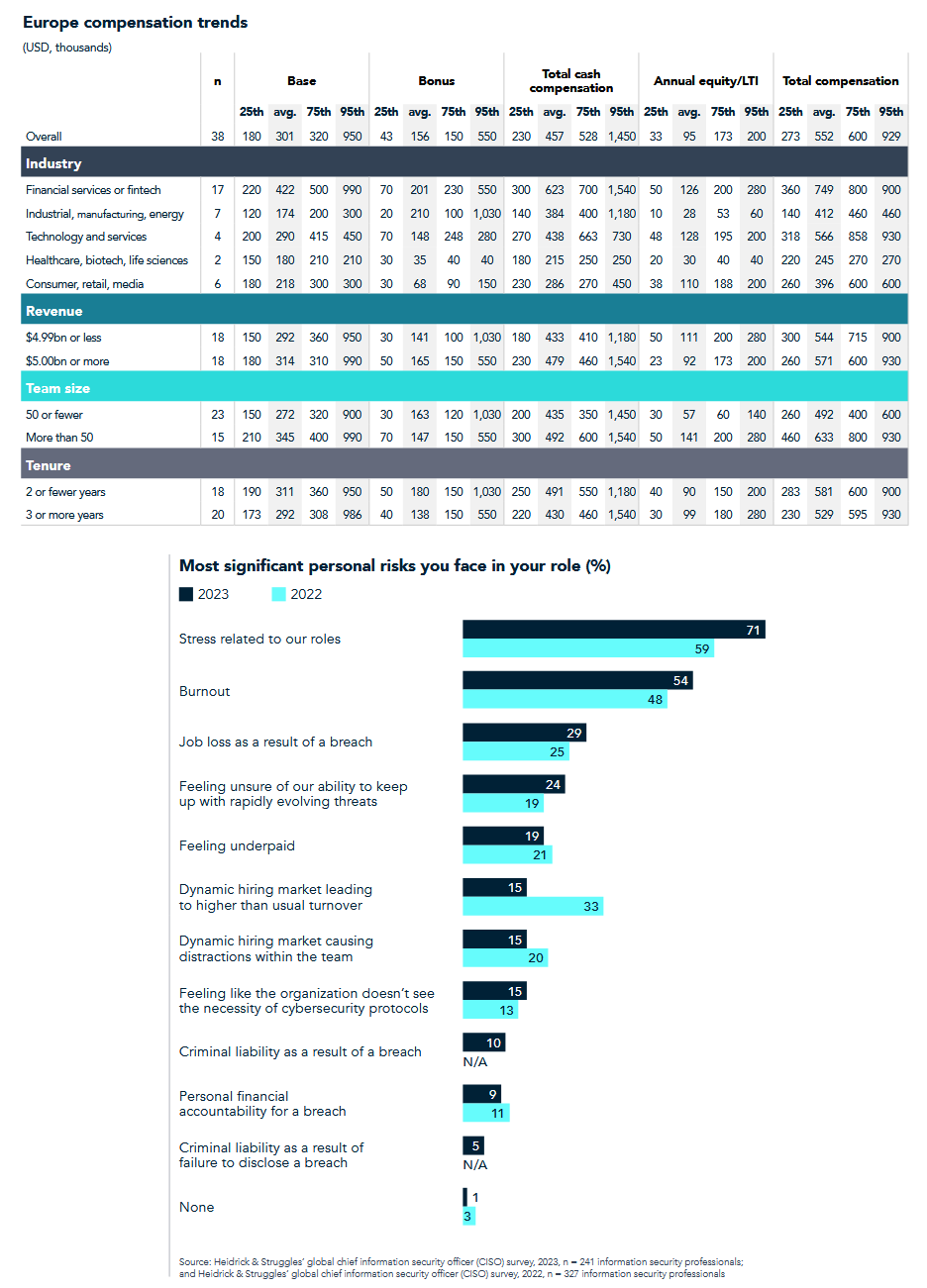 CISO survey: Executive search company Heidrick & Struggles has published the results of a survey with 262 CISOs from around the globe. The survey includes compensation trends and tables for CISOs working in Europe, the US, and Australia, as well as answers on various topics such as job stress factors, board support, severance policies, personal risks, and more. On the same note, Censys has a similar survey/report out, too, focusing on the vulnerability management side of things.