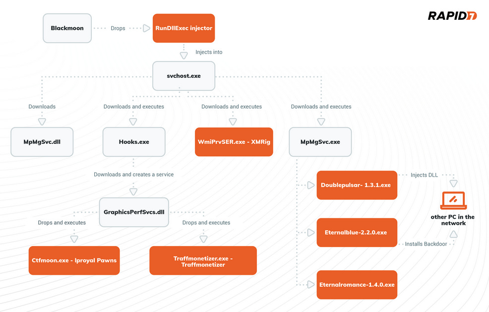 Blackmoon: The operators of the Blackmoon (KRBanker) banking trojan have retooled their code and are now operating as a malware delivery service. The group has been spotted infecting victims with a new version of their trojan and then delivering other payloads, such as cryptominers and proxyware traffic stealers. Blackmoon has been active since 2015 and has primarily operated by redirecting infected users to fake banking login portals where the gang stole its victims' login credentials. According to Rapid7, Blackmoon's recent pivot to a Dropper-as-a-Service model appears to have taken place in November of last year. Blackmoon is the latest in a long list of banking trojan operations that have jumped into the malware-dropping business. Other operations that have gone down this path—with great financial success—include Emotet, TrickBot, and Qakbot.