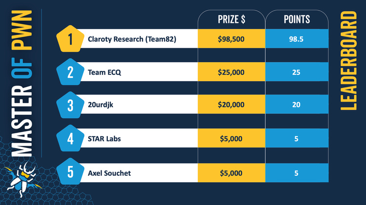 Pwn2Own Miami: The Pwn2Own ICS-themed hacking contest, which took place in Miami last week, has concluded. Team Claroty has won this year's Master of Pwn award after dominating the competition with ten successful exploits. Claroty won $123,500 of the $180,000 awarded during the contest, two-thirds of the entire prize pool. Dominated indeed!