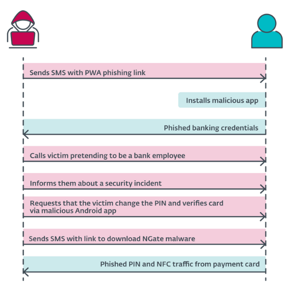 A typical attack involves a threat actor calling a victim posing as their bank. The goal is to get the user to install a malicious app on their device under the guise of a bank security emergency. Victims are instructed to download a (malicious fake bank) app and use it to scan their card's NFC chip to verify their identity and then change the card's PIN code via the app to avoid losing money.