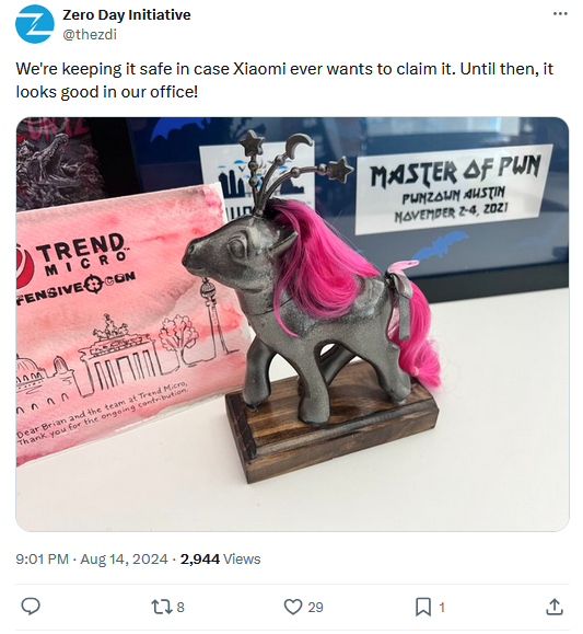 Xiaomi Pwn2Own patching scandal: Two security researchers have accused Xiaomi of intentionally sabotaging their exploit during the Pwn2Own hacking contest last year. Ken Gannon and Ilyes Beghdadi of NCC Group say the Chinese company released a patch for its flagship Xiaomi 13 Pro smartphone before the Pwn2Own contest, only to remove it days later. The researchers believe the company tried to avoid the bad press of having its device hacked during the contest and didn't prioritize the security of its own users. The company's actions got Xiaomi the Lamest Vendor Response award at this year's Pwnie Awards. [Additional coverage in HackHunting]