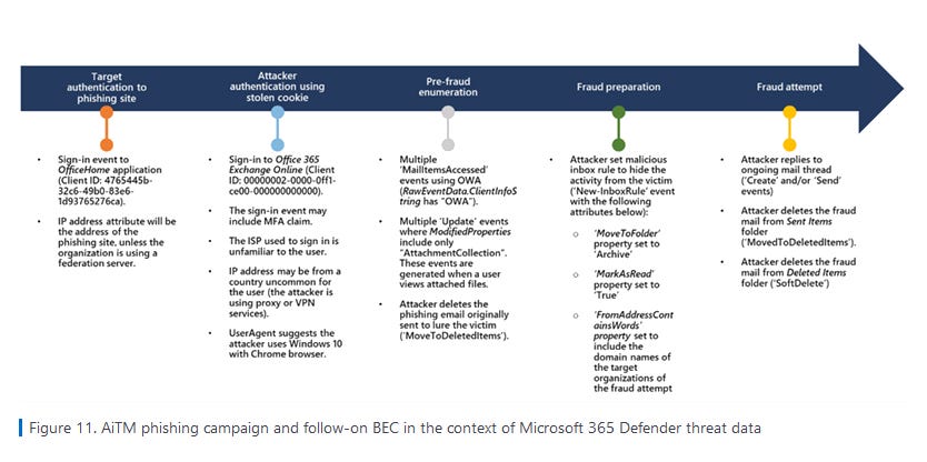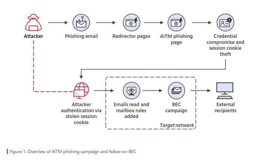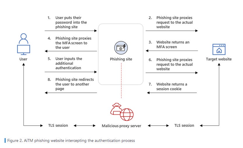 Reverse proxy phishing: Microsoft has published a report on a large-scale phishing campaign that used reverse proxy servers for its phishing sites. This technique, also known as adversary-in-the-middle (AiTM) phishing, allowed the threat actors to obtain not only credentials from victims but also the authentication cookies that are generated after victims go through a legitimate 2FA challenge. Microsoft said this campaign has been running since September 2021, has hit more than 10,000 organizations, and has been linked to several BEC attacks.