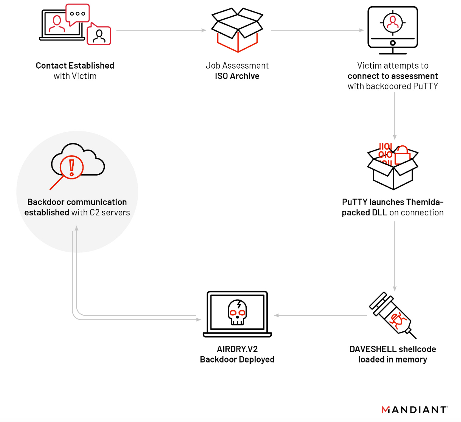 UNC4034: In a report on Wednesday, Mandiant also covered a pretty novel phishing technique employed by UNC4034, a suspected North Korean APT. The method relies on getting victims to download and use a backdoored version of the PuTTY utility.