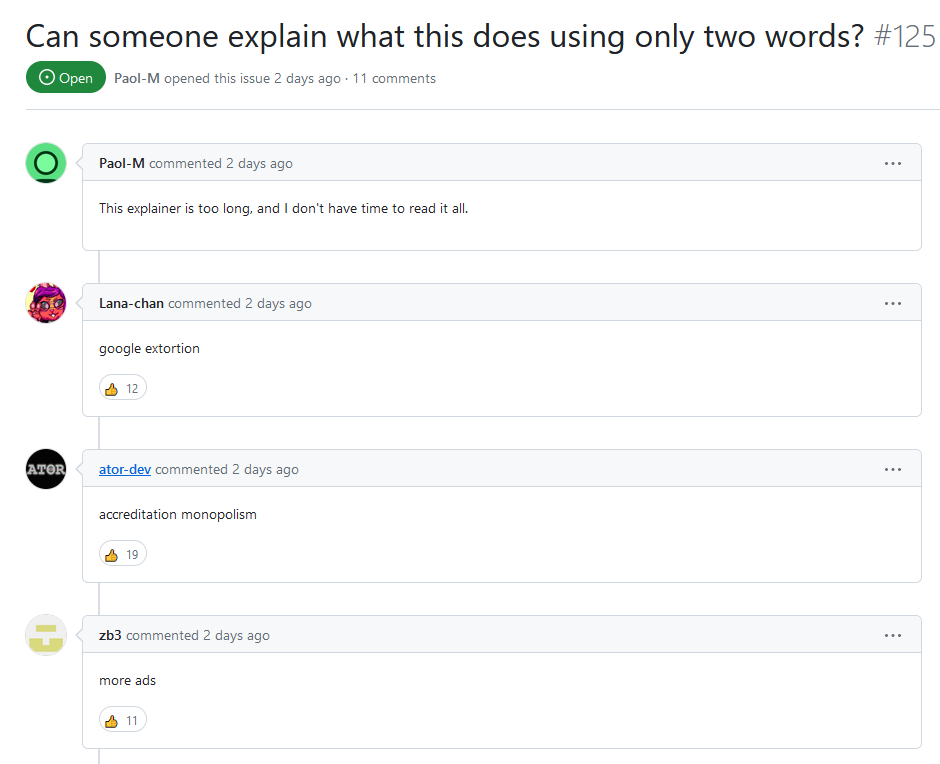 To say that the response to the proposal has been negative would be a gross misrepresentation of what has happened on the project's GitHub Issues page, where barring 5-6 entries that actually raise an issue, most of the reports take shots at the API and Google itself.