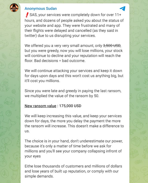 SAS extortion: Totally-not-Russian hacktivist group Anonymous Sudan is requesting $175,000 from Scandinavian Airlines to stop DDoS attacks on its websites. Guess the group got over their hacktivism phase quickly and is now into full-blown extortion.