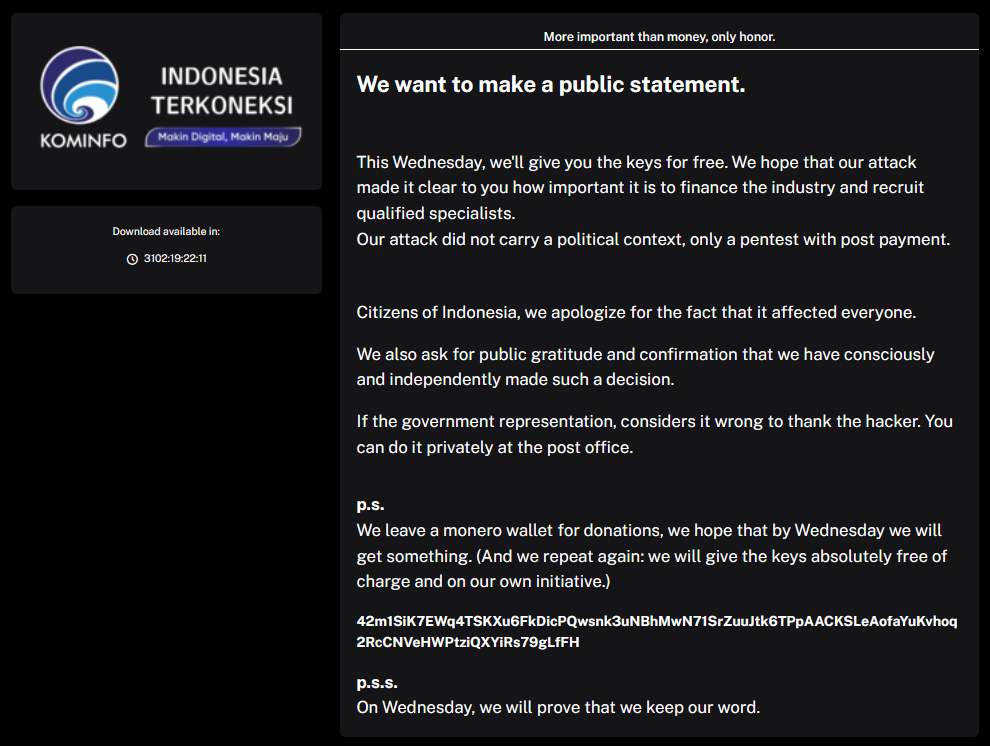 Indonesia ransomware attack update: The group behind a ransomware attack on the Indonesian government's national data center has apologized for their intrusion and promised to provide a free decryption key. Indonesian officials previously stated they would not pay a ransom demand of $8 million. The free decryption key is a godsend for the Indonesian government. Officials previously said they expected to permanently lose most of the encrypted data since it was not backed up anywhere else and was unrecoverable. The government blamed the attack on its "stupidity," and several officials have tendered their resignation following the June 20 attack. [Additional coverage in the ABC]