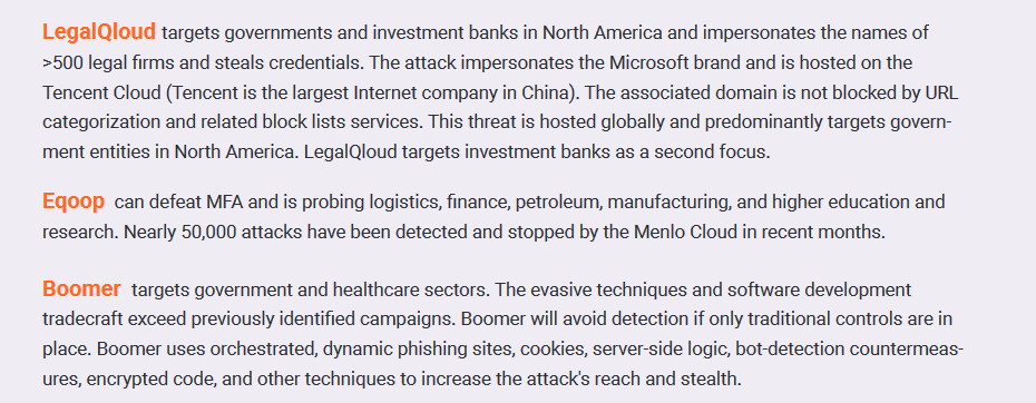 New phishing groups: Menlo Security has discovered three new cybercrime groups engaged in complex phishing campaigns targeting the world's top companies. The new LegalQloud group impersonates legal firms and has targeted governments and investment banks in North America. The Eqoop group uses the NakedPages phishing toolkit capable of bypassing MFA, and has primarily targeted executives across ten different industry verticals globally. The last Boomer group uses an advanced custom-made phishing kit and focuses on targets in the government and healthcare sectors.
