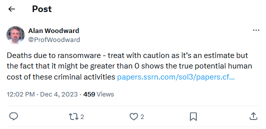 As Professor Alan Woodward from the University of Surrey points out, the study puts out estimates, but the conclusion to be taken from the research is that the number of deaths caused by ransomware is "greater than 0."