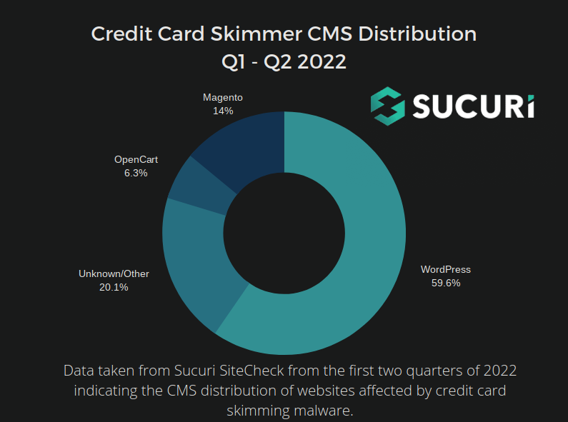 Web skimmers: GoDaddy's Sucuri team has analyzed some of the less-common credit card skimmer scripts that it found in malware campaigns this year. According to the same report, Sucuri said that almost 60% of all skimmer detections this year have been for scripts installed on WordPress-based sites; a change from July 2021, when the vast majority of web skimmers were installed on Magento-based stores.