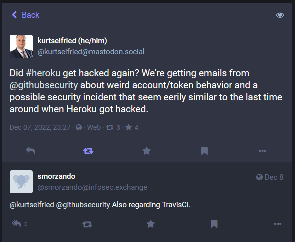 GitHub/Heroku/TravisCI security incident: Okta told customers that a threat actor gained access to its GitHub repositories and stole some of its source code. RiskyBizNews understands this incident is actually part of a larger set of GitHub account intrusions that took place earlier in December. At the time, threat actors used Heroku and TravisCI integrations to access GitHub accounts in an incident similar to one that happened earlier in the year, in April. GitHub has not returned a request for comment.