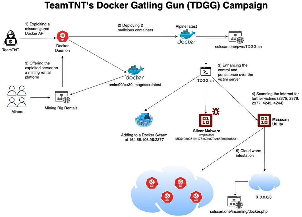 TeamTNT TDGG: AquaSec has published a report on Docker Gatling Gun, a campaign targeting Docker servers from the TeamTNT crypto-mining gang.