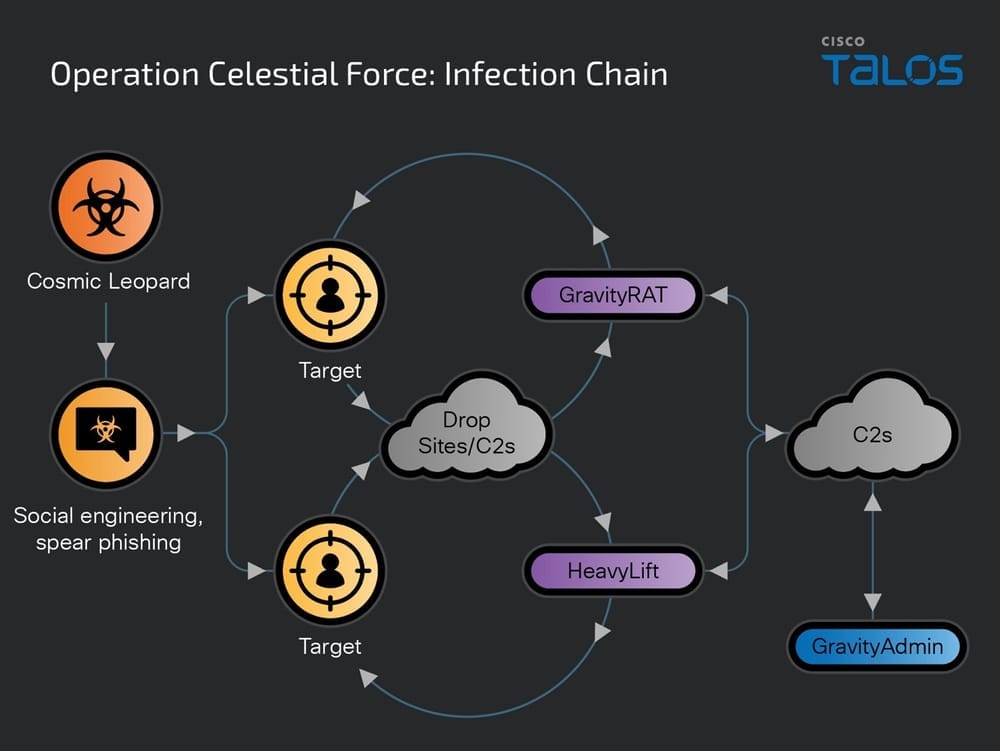 Cosmic Leopard: Cisco Talos has discovered a new Pakistani APT group focused on espionage and surveillance of Indian targets. Cisco says the Cosmic Leopard group has been active since 2018 and operates a malware platform named GravityAdmin. The group uses the platform to manage infections with the GravityRAT on Android and the HeavyLift malware on Windows. Researchers say some Cosmic Leopard TTPs overlap with another Pakistani APT group named Transparent Tribe.